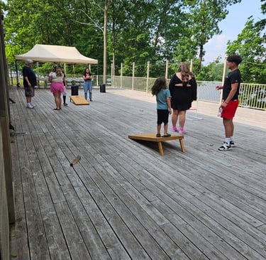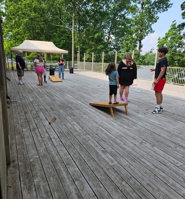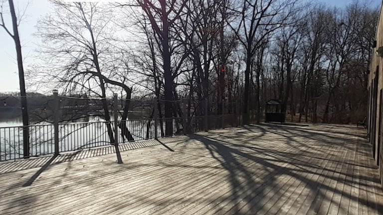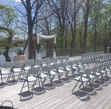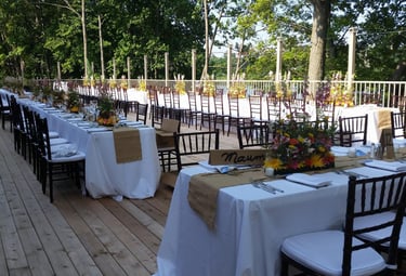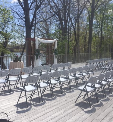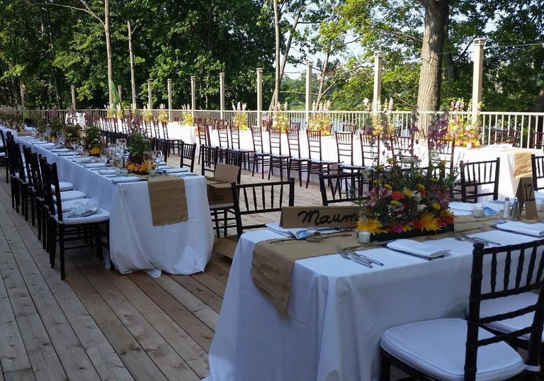 Enjoy our 96'x32' deck overlooking Red Mill Pond, perfect for outdoor events and relaxation.